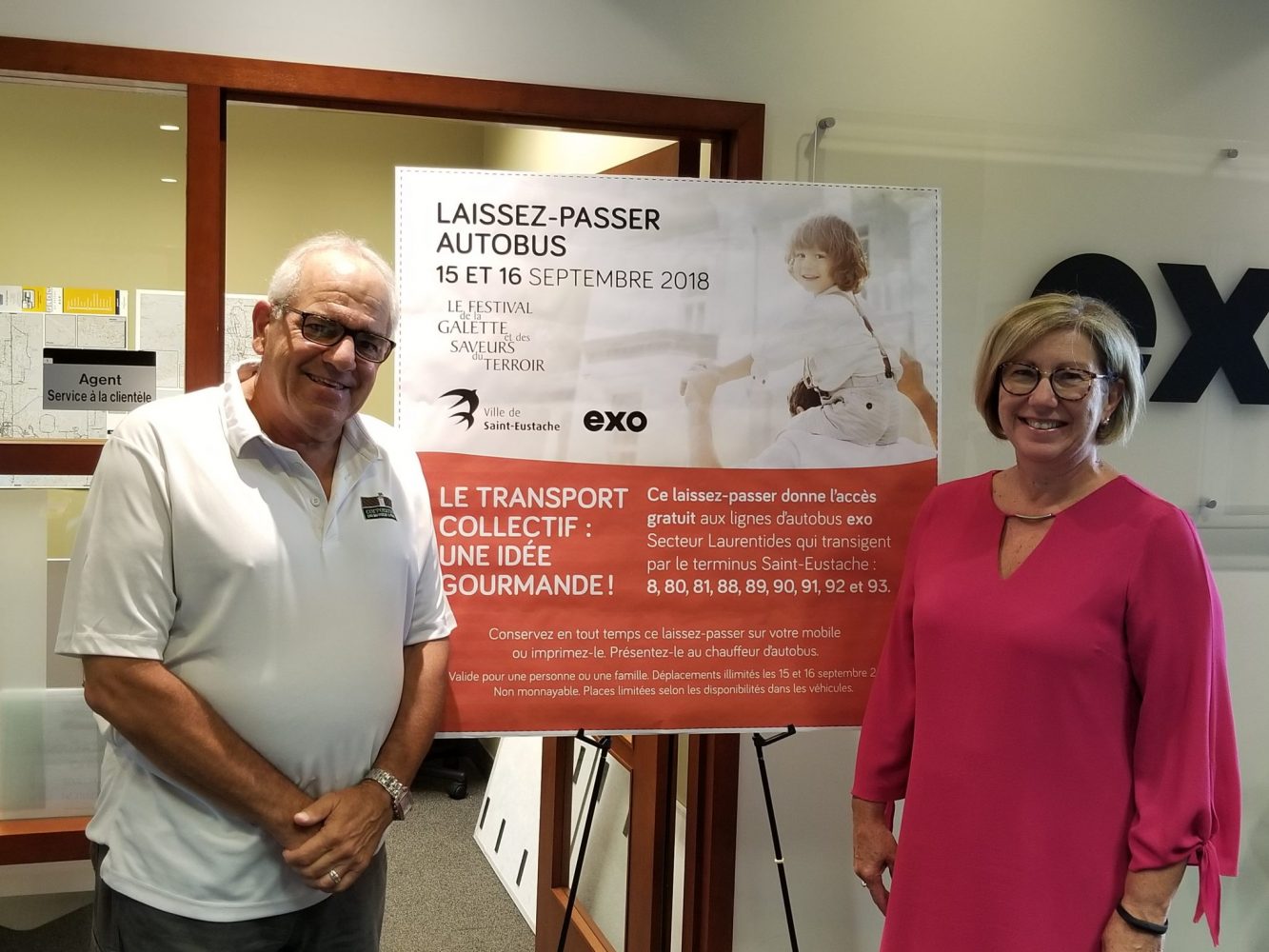 Sain-Eustache, 13 août 2018 – Dans le cadre du Festival de la galette et des saveurs du terroir qui se déroulera dans le Vieux-Saint-Eustache, la Corporation du Moulin Légaré et exo sont fiers d’annoncer la gratuité du service de transport collectif les samedi 15 et dimanche 16 septembre prochain, et ce, sur les neuf lignes régulières d’autobus qui transigent au Terminus Saint-Eustache.